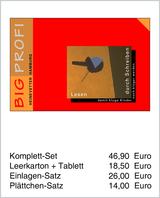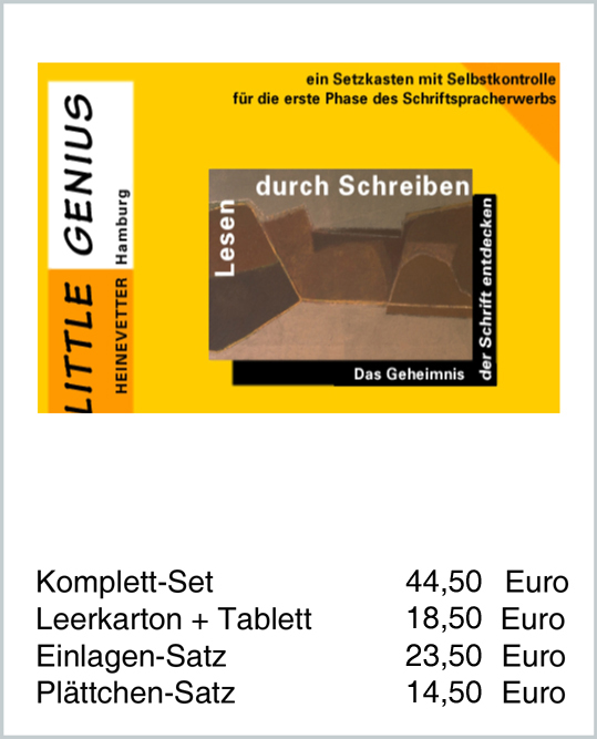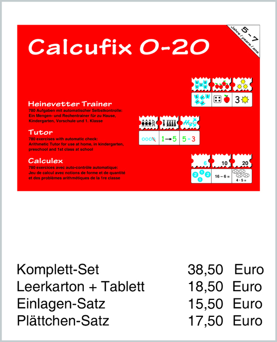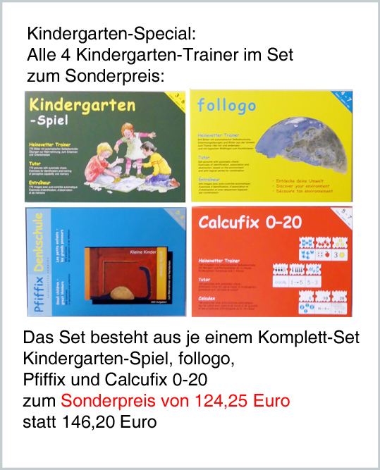 Für unsere Kinder sind - und bleiben - Spielen und Gemeinschaftspflege die wichtigsten Grundlagen der Entwicklung. Dies bedeutet jedoch keineswegs, dem Vorschulkind jede Art kognitiver Förderangebote zu verweigern. Gerade im Hinblick auf die Schulreife sind alters- und entwicklungsgemäße Lernspiele von besonderer Bedeutung - Spiele wie die von Heinevetter. Der steigende Schwierigkeitsgrad der vielseitigen Aufgabenangebote entspricht in etwa dabei dem fortlaufenden Entwicklungsstand in der genannten Altersstufe. |