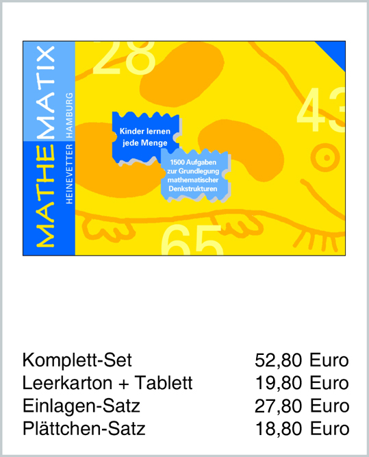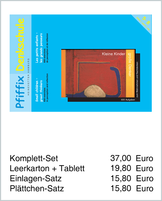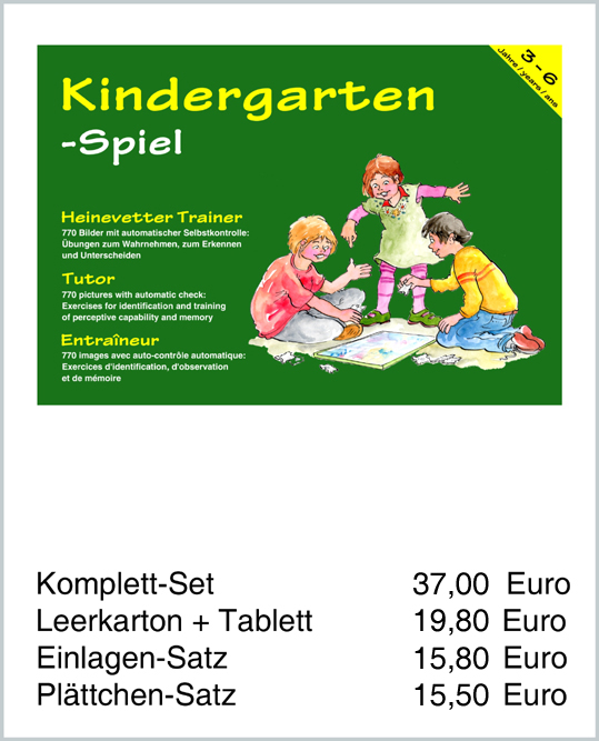 Für unsere Kinder sind - und bleiben - Spielen und Gemeinschaftspflege die wichtigsten Grundlagen der Entwicklung. Dies bedeutet jedoch keineswegs, dem Vorschulkind jede Art kognitiver Förderangebote zu verweigern. Gerade im Hinblick auf die Schulreife sind alters- und entwicklungsgemäße Lernspiele von besonderer Bedeutung - Spiele wie die von Heinevetter. Der steigende Schwierigkeitsgrad der vielseitigen Aufgabenangebote entspricht in etwa dabei dem fortlaufenden Entwicklungsstand in der genannten Altersstufe. |