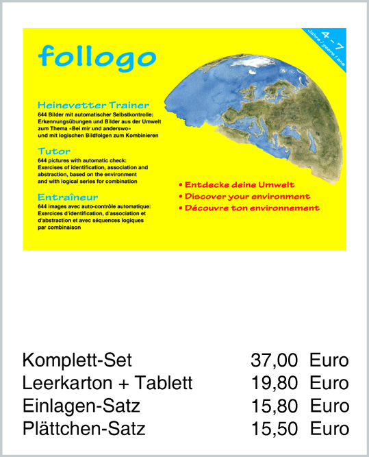 | Die Kinder betrachten diese Spiele als Puzzles. Doch sind es ganz besondere Puzzles: Puzzles mit automatischer Richtigkeitskontrolle. Sie fördern ein allgemeines Regelbewusstsein und eine altersgemäße Selbstständigkeit und bahnen für die Schule eine gute und selbstkritische Arbeitshaltung an. | ![]() |
